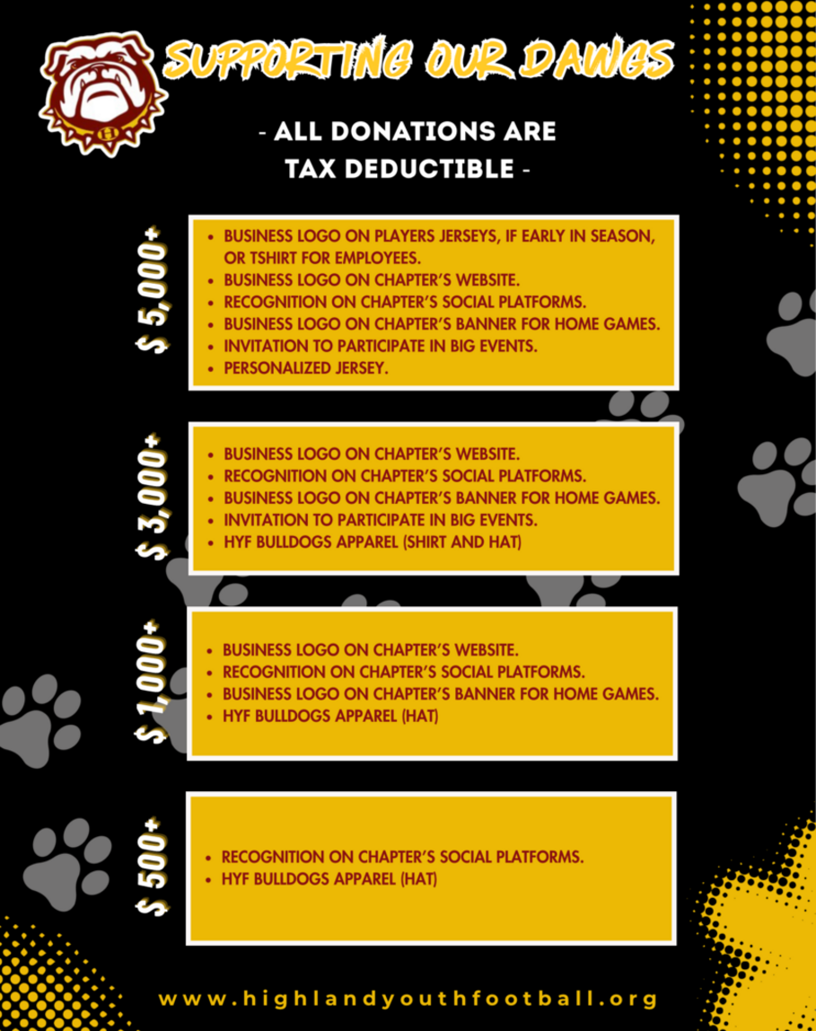 As a thank you for your support, HYF will add your business logo to our website and social media account. Please email us your business logo at HYFbulldogs@gmail.com.